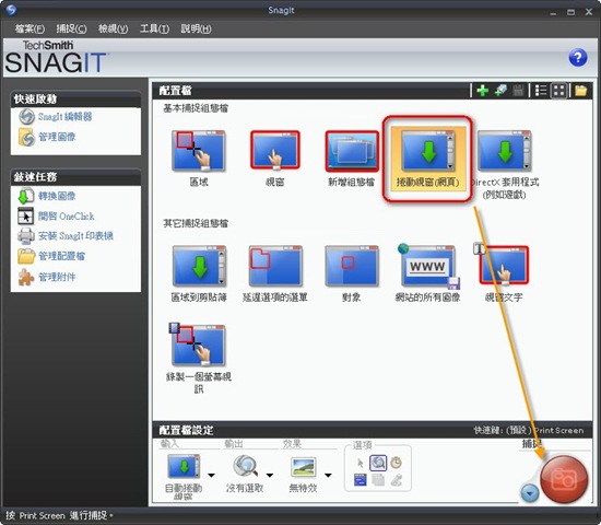 操作方法與SnagIt一模一樣,按下上圖的紅色框框起來的按鈕就開始擷取,唯一要注意的是,要擷取的網頁必須將畫面移到最上面(按下Home鍵),等它擷取好,一樣會跳至編輯畫面